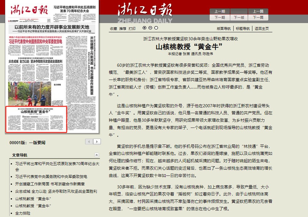 6月26日,《浙江日報》頭版以《山核桃教授“黃金牛”》為題報道全國優秀共產黨員、浙江省勞動模范、“最美浙江人”、浙江省特級專家、我校亞熱帶森林培育國家重點實驗室副主任黃堅欽教授,30余年如一日地奔走山野助果農增收、扎根基層一線干事創業,讓黨旗在基層一線高高飄揚的先進事跡。
