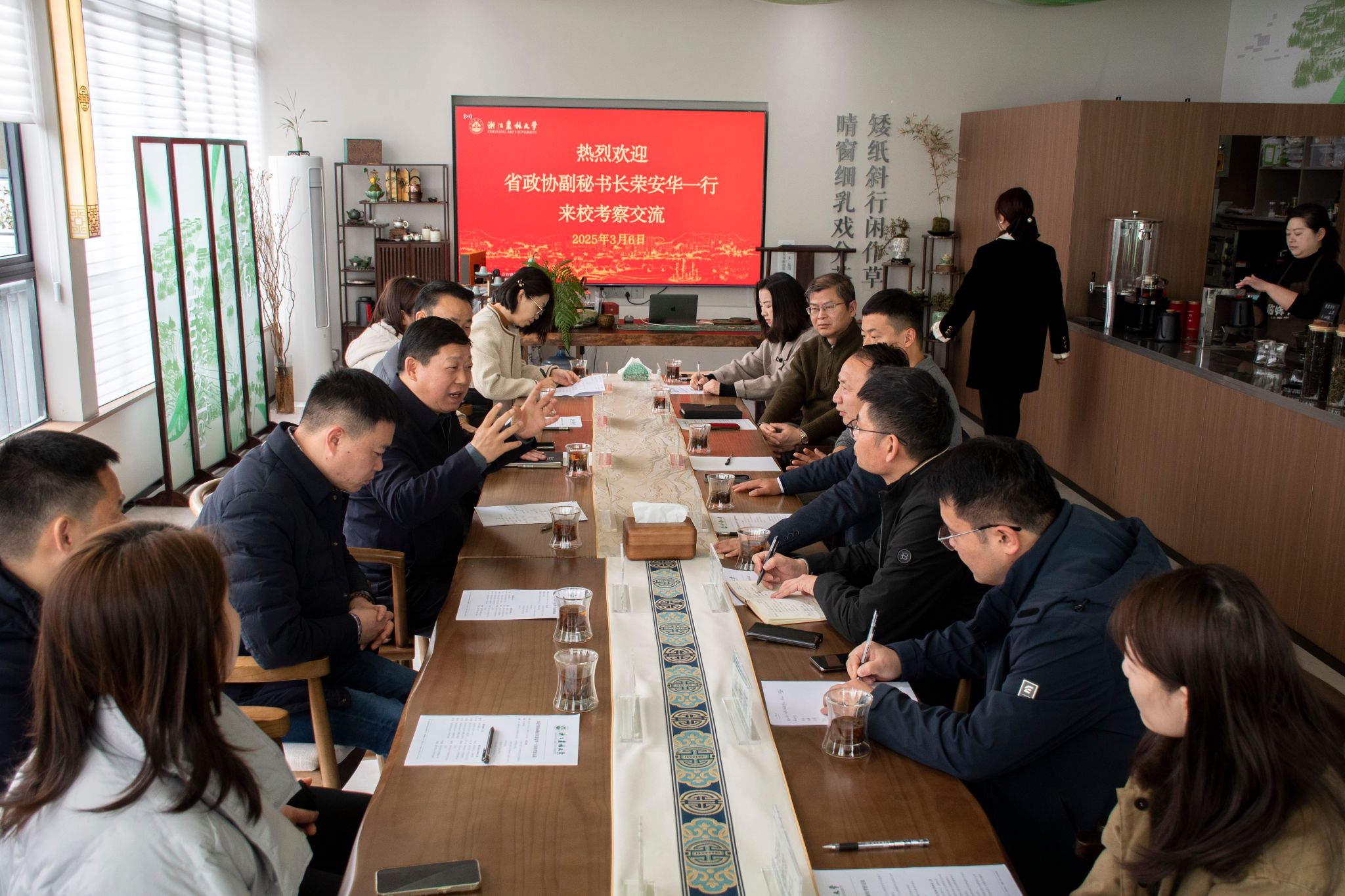 榮安華對學校的熱情接待表示感謝,并介紹了省政協委員活動中心茶空間設計方面有關情況。他表示,浙江農林大學在茶文化建設方面成效明顯,底蘊深厚,值得借鑒。希望雙方能夠建立長期的互動關系,在茶產品更新展示、學生實習、茶學講座、茶藝視頻等方面為委員活動中心茶空間建設提供支持,助力建設好具有浙江特色、國內獨有的茶空間。