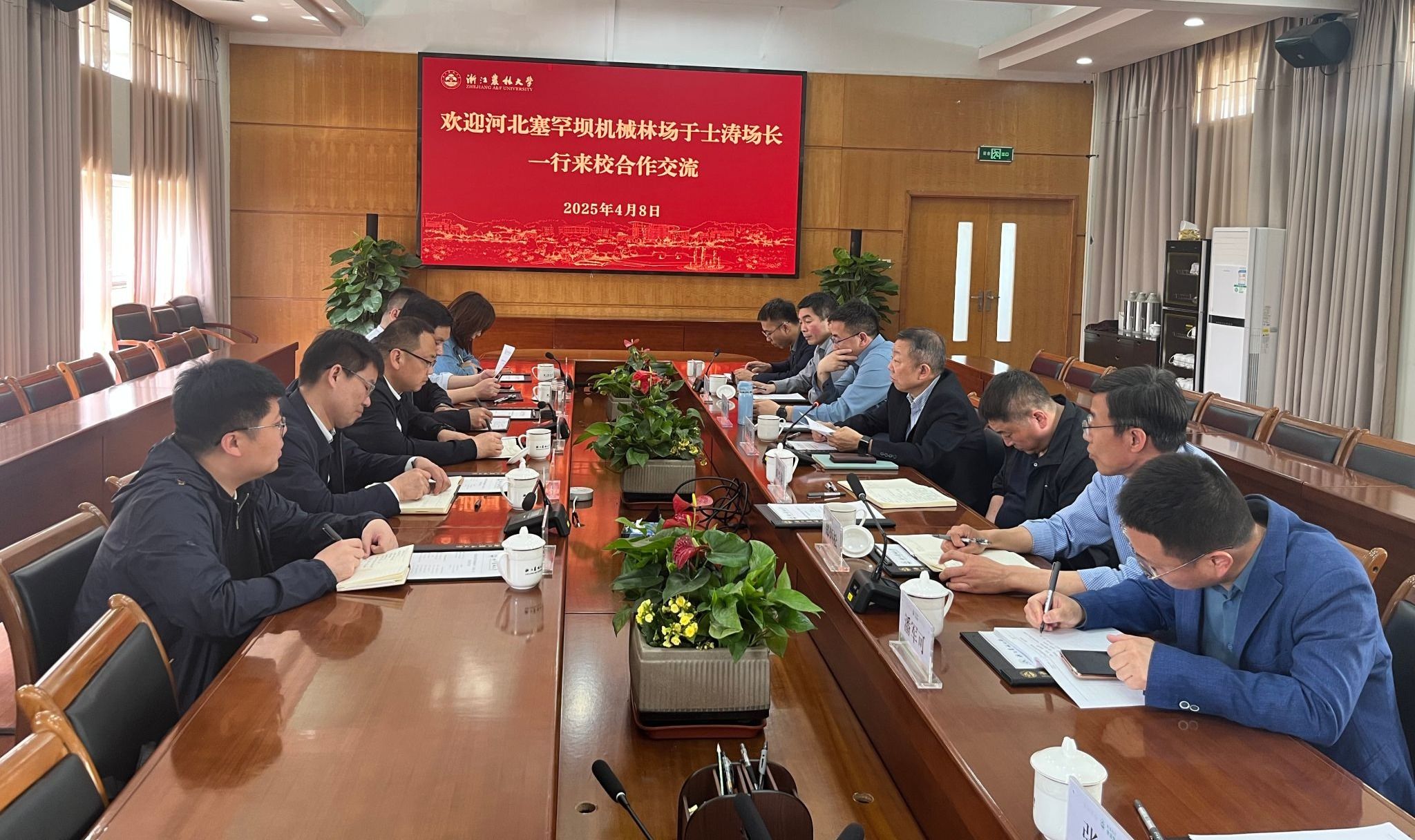 吳家勝對(duì)于士濤一行的到來(lái)表示歡迎,并簡(jiǎn)要介紹了學(xué)校的基本情況。他指出,塞罕壩作為中國(guó)林業(yè)生態(tài)建設(shè)的標(biāo)桿,不僅是生態(tài)修復(fù)的典范,更是“牢記使命、艱苦創(chuàng)業(yè)、綠色發(fā)展”精神的生動(dòng)詮釋。去年雙方就研究生培養(yǎng)、森林經(jīng)營(yíng)、珍稀樹(shù)種保護(hù)等方面的校場(chǎng)合作達(dá)成了初步合作意向,并與六家農(nóng)林類(lèi)高校和科研院所共同揭牌成立了塞罕壩機(jī)械林場(chǎng)科研工作站。吳家勝表示,在前期合作的基礎(chǔ)上,我校將充分發(fā)揮在森林生態(tài)系統(tǒng)培育、生物多樣性保護(hù)、防災(zāi)減災(zāi)、數(shù)字賦能“兩山”轉(zhuǎn)化等方面的特長(zhǎng),全力支撐塞罕壩機(jī)械林場(chǎng)高質(zhì)量發(fā)展。