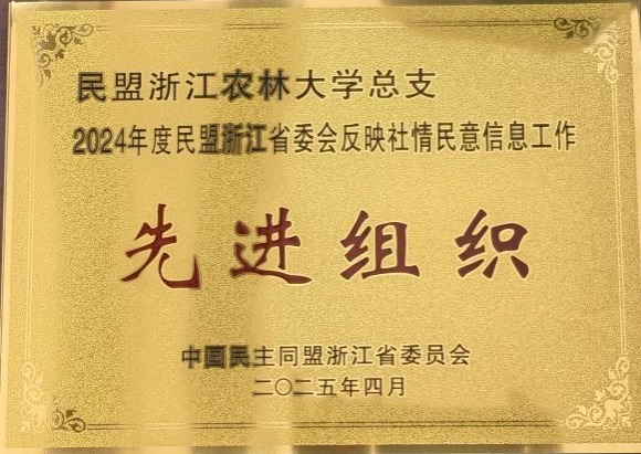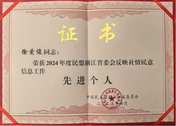 4月25日,民盟省委會2025年參政議政工作會議在杭州召開。會上,對2024年度在參政議政工作及反映社情民意信息工作中表現突出的先進單位和個人進行了表彰。民盟學??傊Й@“反映社情民意信息工作先進組織”稱號,民盟學??傊е魑⒏毙iL徐愛俊獲“反映社情民意信息工作先進個人”稱號。