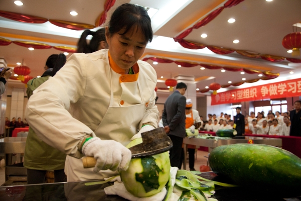 首先是講求速度與規范的“冬瓜去皮”環節。各食堂的代表參賽選手聽到比賽口令一下,便急速拿著削皮刀開始動工,冬瓜皮一條條飛舞出去,不禁為他們嫻熟的削功折服。