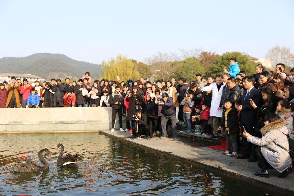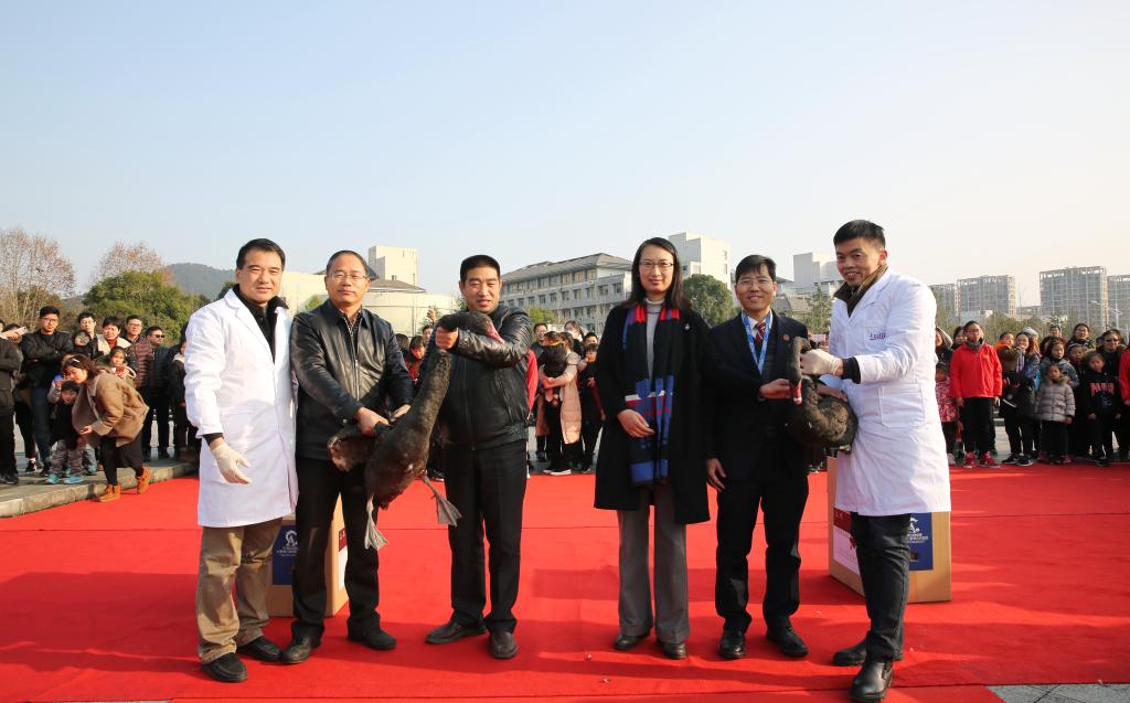 胡祖吉、鄭本軍與學(xué)院院長宋厚輝、黨總支書記仲曉婷放生中澳動物健康大數(shù)據(jù)分析聯(lián)合實驗室的“新神獸”黑天鵝,共同見證動科院獻禮校慶。