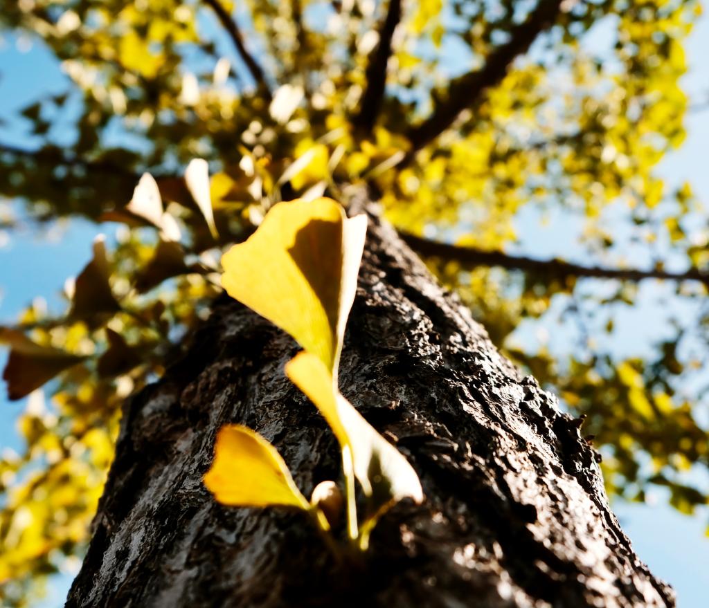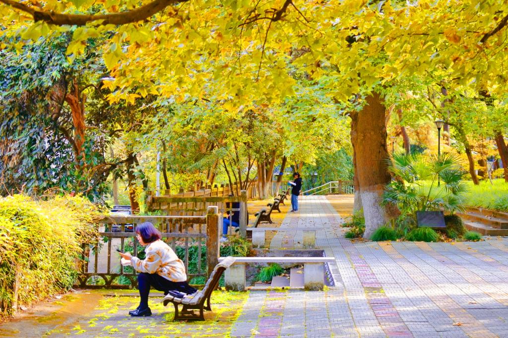 暖陽下,秋色一點點在林稍間抹開。沐浴著秋日陽光,坐在黃透的銀杏樹下,一幅幅醉美秋意畫卷正在浙農林大校園徐徐展開,葉片和枝椏的縫隙間,是光與影的完美融合,是色與彩的交織碰撞。教學樓門外的楓樹也擎起了火炬,層林盡染,漫山紅遍,那火熱的色彩點燃了生命,也點燃了秋天。松柏翠綠依舊,沉穩地微笑著,注視著這并不缺少色彩的秋。