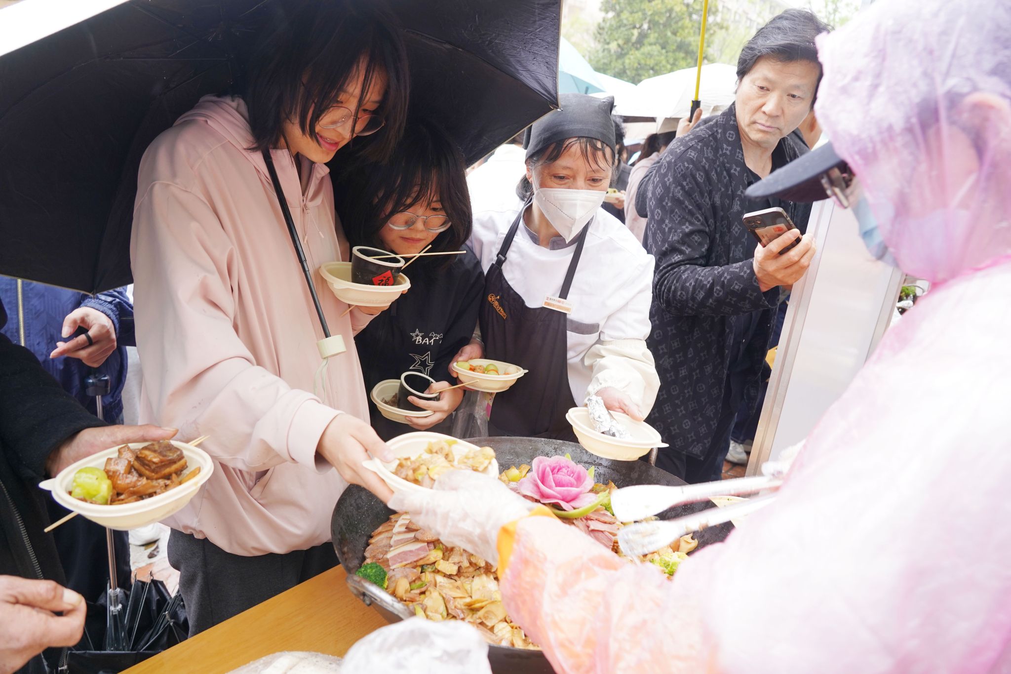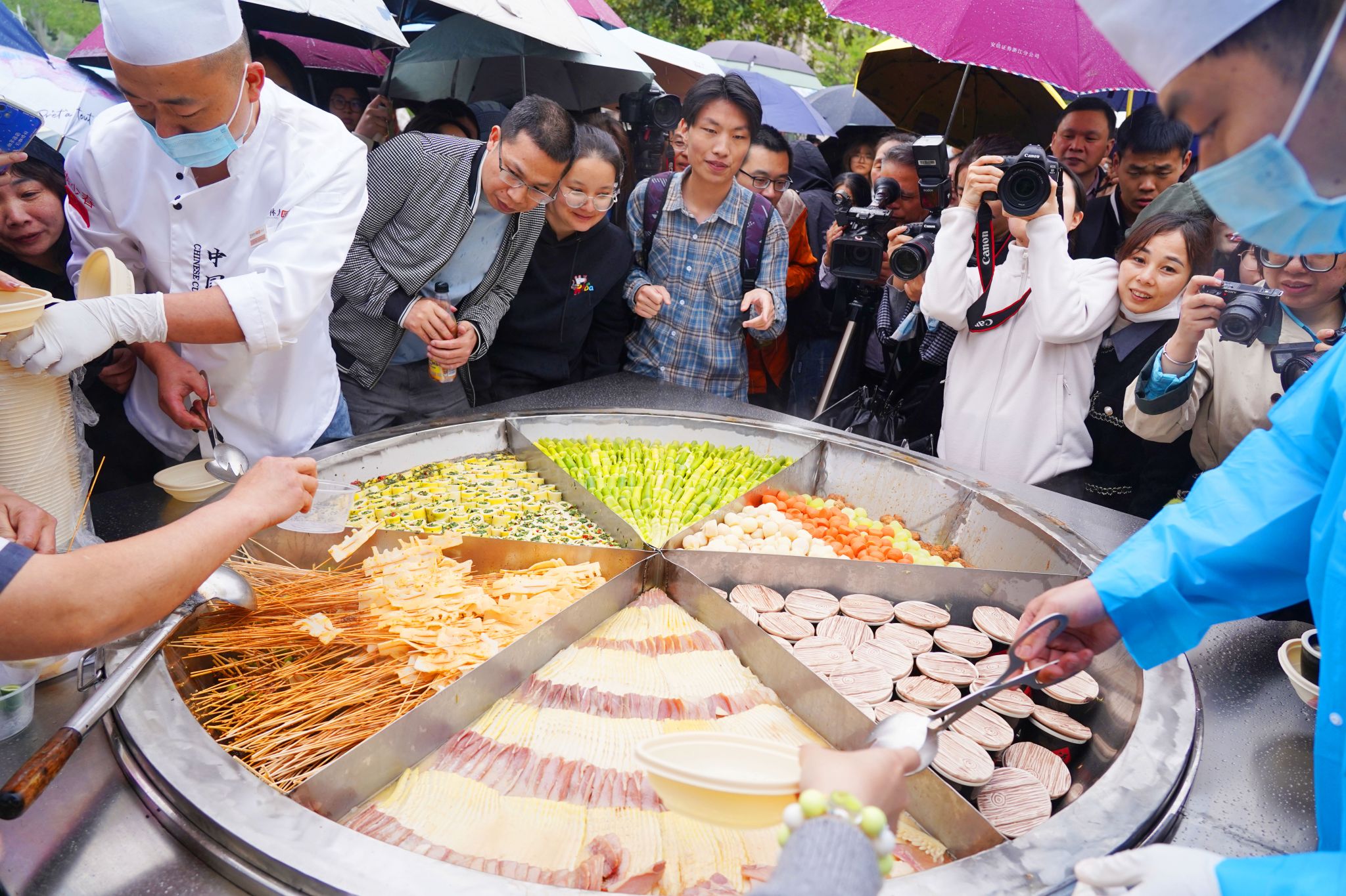 隨著鐵鍋的蓋子緩緩被掀起,濃郁的鮮香引得排隊的師生垂涎欲滴,千名師生人手一份,共同品嘗剛剛出鍋的6道竹筍菜肴。接著,數千名師生在這里參與剝筍比賽,學燒不同口味的筍菜,品嘗各種竹筍佳肴,體驗竹子領域的最新科技成果,欣賞竹材設計的工藝品,感受竹詩詞、竹音樂等竹文化。