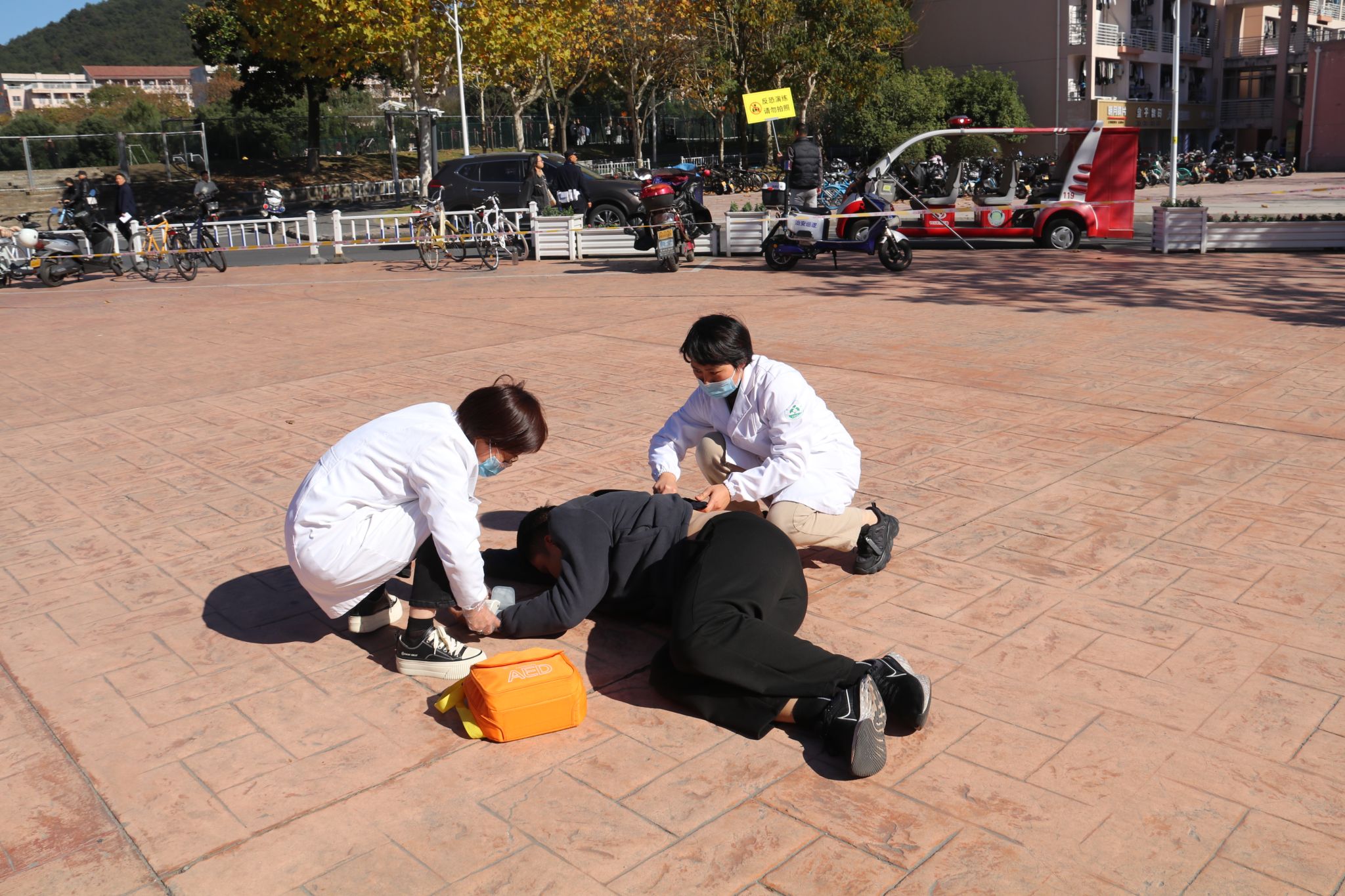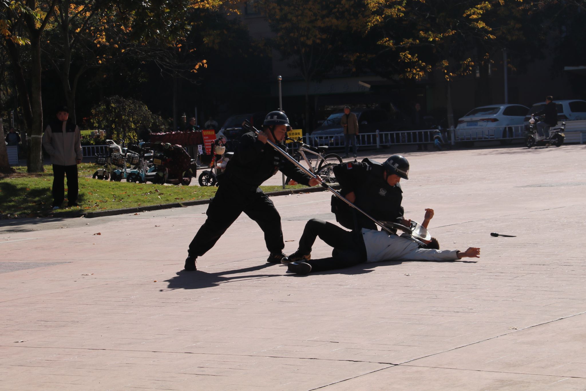 本次演練模擬食堂爭端引起刀斧砍殺,威脅師生安全。食堂人員發現勸阻后第一時間向校110指揮中心報警,指揮中心接警后啟動反恐防暴應急預案,3分鐘內,學校應急小分隊、交警到達現場,分工協作,進行人員疏散、交通管制,并快速將歹徒制服。衛生所醫護人員接到警情后,在預定時間內趕到現場,救護傷員。