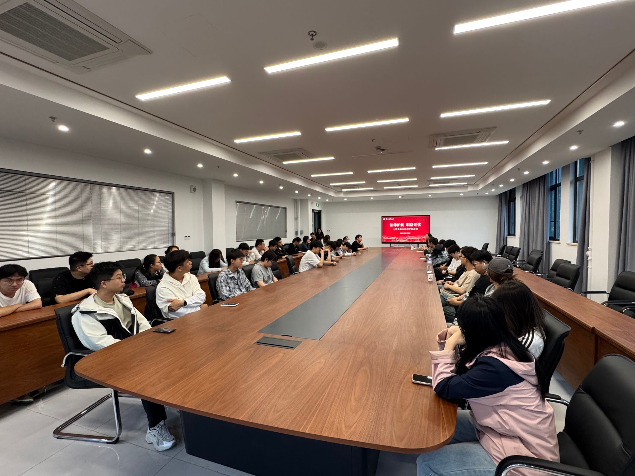 葉小囡律師聚焦大學生就業法律需求,圍繞勞動合同簽訂要點、試用期規定、工時與加班和社會保險、調崗與降薪、勞動關系的解除與終止、保密與競業六個方面展開深度講解。她結合典型案例,深入剖析了求職應聘中常見的“試用期陷阱”“薪資爭議”“競業限制條款”等法律問題,并針對實習實踐、創新創業等場景提供了實用建議。王政剛律師重點圍繞大學生就業刑事犯罪風險展開講解,以鮮活的案例對“知識產權侵權”“掛名法定代表人”等違法犯罪行為進行警示教育,提醒大學生在就業過程中提高警惕。律師強調,法律知識是職業發展的“護身符”,提前掌握法律工具,既能規避風險,也能在權益受損時高效維權。