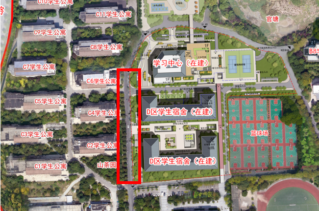 學(xué)生宿舍C6東面路口至山茶園東面路口,具體路段詳見下圖紅框區(qū)域。