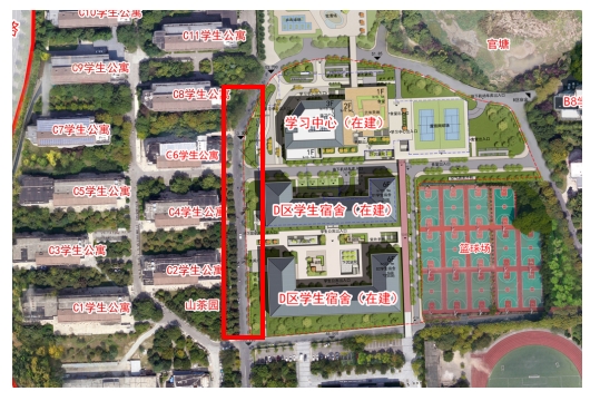 學生宿舍C2至C8東面道路,具體路段詳見下圖紅框區域。