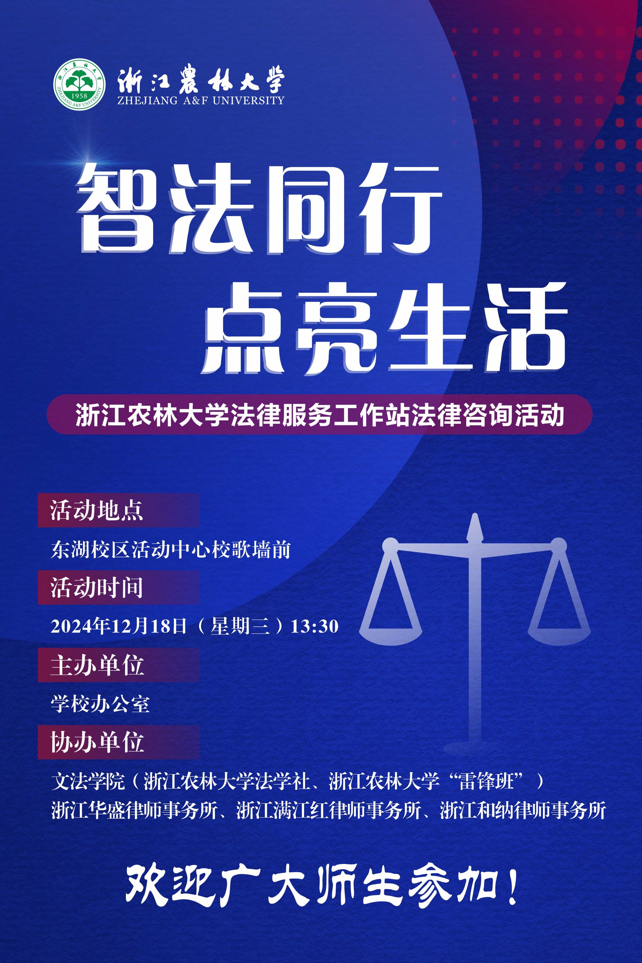 為落實《浙江農林大學法律服務工作站建設方案》,加強法治校園建設,提高師生法律素養,為廣大師生提供專業、便捷的法律咨詢服務,幫助師生解決在學習、科研、生活等方面遇到的法律問題,現決定舉辦法律服務工作站法律咨詢活動,具體活動事項通知如下: