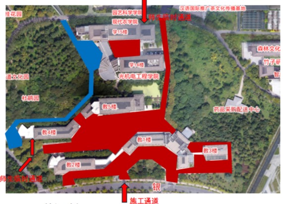 2025年1月11日,因東湖校區教學區廣場磚面層及地下管網改造工程施工需要,計劃對教學樓、學14、學15周邊區域道路進行封閉,現將有關事項公告如下: