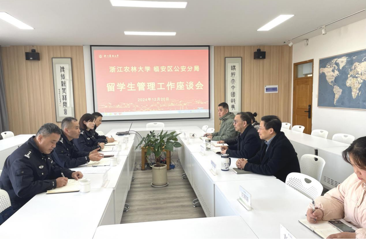 12月20日,杭州市公安局臨安區分局副局長羅雪峰一行來校調研,與國教學院舉行留學生管理工作座談會,出入境管理科和錦北派出所等負責人陪同。座談會由院長趙有華主持,學院相關負責人、全體輔導員和招生老師參加會議。