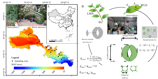 Fig. 1Geographic distribution of the sampling sites ofUlmus pumilaalong the precipitation gradient in China (A) and the scheme for coordination of leaf photosynthetic, gas exchange, stomatal and water relations traits (B).