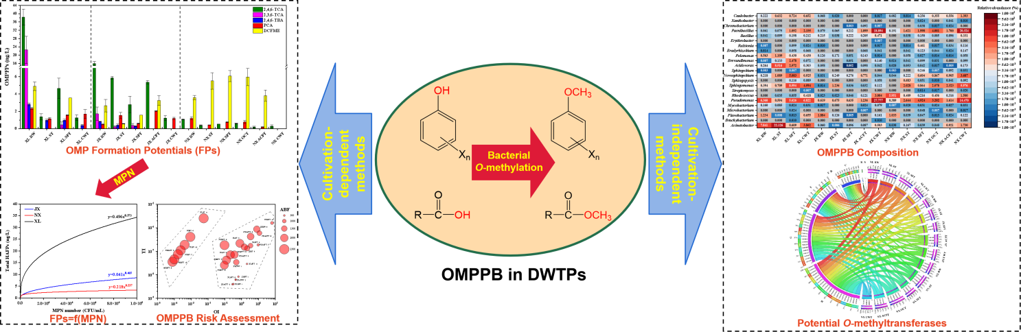O-甲基化污染物(OMP)由含羥基前體物(如鹵代酚、雙氯芬酸等)經微生物O-甲基化作用生成,具有強烈的土霉味和潛在致病性,已成為當前飲用水中一種不可忽視的新污染物。然而,作為OMP的主要貢獻者——OMP生成細菌(OMPPB)在供水系統,特別是在飲用水廠中的分布情況和甲基化特性尚不清楚。本研究綜合利用培養技術和非培養技術,圍繞生物量測定、群落結構表征和污染風險評估等多個方面對不同飲用水廠中的OMPPB進行了系統的調查研究,主要研究結果為:OMP生成勢(OMPFP)在不同水廠及處理工藝間存在顯著差異;水處理工藝可有效降低OMPPB的數量,卻增加了其在細菌總數中的比例;不同可培養OMPPB對3種典型前體物存在選擇性,這造成了它們的產物在致嗅性、毒性和生物富集性上存在顯著差異;水廠工藝可驅動飲用水中OMPPB群落結構和相關O-甲基轉移酶發生改變;Mantel分析顯示OMPPB群落組成與OMPFP組成之間存在關聯,其中Mycobacterium屬和Pelomonas屬可能起到了關鍵作用。最后,文章還針對飲用水廠中OMPPB風險評估和控制方法的建立提出了若干建議。本研究可為飲用水中微生物源新污染物的生成與控制研究提供證據支撐。