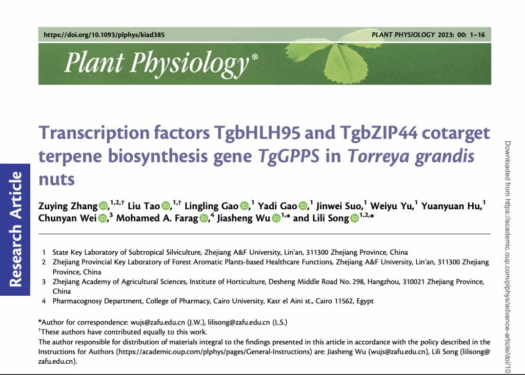 近日,《Plant Physiology》(植物生理)在線發(fā)表了浙江農(nóng)林大學(xué)香榧團(tuán)隊(duì)的題為《Transcription factors TgbHLH95 and TgbZIP44 cotarget terpene biosynthesis geneTgGPPSinTorreya grandisnuts》(TgbHLH95-TgbZIP44蛋白復(fù)合體協(xié)同調(diào)控香榧堅(jiān)果萜類合成基因TgGPPS)的研究論文,揭示了TgbHLH95-TgbZIP44轉(zhuǎn)錄復(fù)合體調(diào)控TgGPPS參與香榧后熟萜類合成的分子機(jī)制。