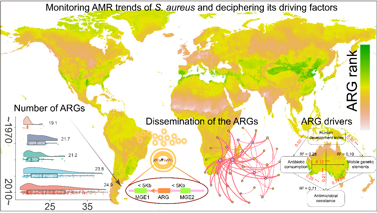 該論文探究了100多年來全球食源性致病菌—金黃色葡萄球菌(Staphylococcus aureus)耐藥基因的進化的驅動因素及傳播機制。浙江農林大學食品與健康學院方冠宇老師為論文的第一作者和通訊作者,劉興泉教授為文章的通訊作者。