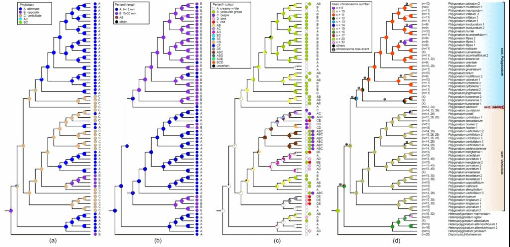 圖2祖先性狀重建(a)葉序,(b)花被管長度,(c)花被顏色,(d)基本染色體數目