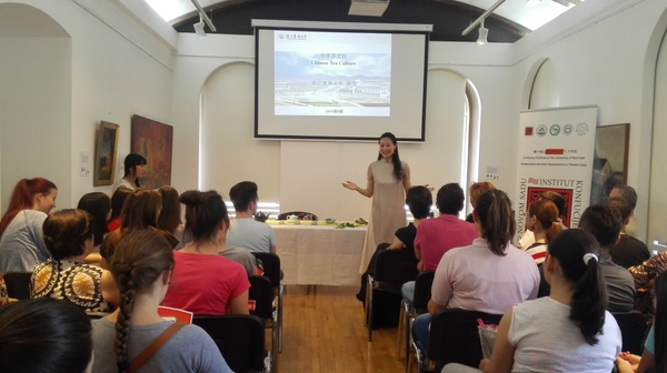 24日,在諾大孔院Karlovci語(yǔ)言高中漢語(yǔ)教學(xué)點(diǎn), “漢語(yǔ)國(guó)際推廣茶文化傳播基地”茶文化培訓(xùn)部鐘斐老師做了題為“一帶一路與中國(guó)茶文化傳播”的知識(shí)講座。期間,與現(xiàn)場(chǎng)師生進(jìn)行了問(wèn)答互動(dòng),場(chǎng)面熱鬧。講座后,與兩位中國(guó)書畫家合作,為師生們展示了茶文化藝術(shù)和中國(guó)書畫藝術(shù)的魅力,獲得了師生們的高度贊譽(yù)。
